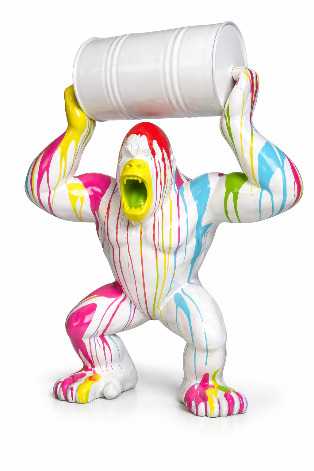 The sculpture features a roaring gorilla lifting a barrel overhead while vibrant high gloss paint drips cascade across the body. The contrast between the dynamic form and the colorful pop art inspired finish creates a striking visual balance of power and modern creativity.